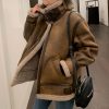 This thick fur lined faux sheepskin leather bomber coat features plush & fuzzy full shearling, metal zip up closure, 2 pockets, Belted durable hem and Long sleeves. This leather jacket with shearling is for any body type, any height, for a lots of layers underneath, and for any chilly cold weather